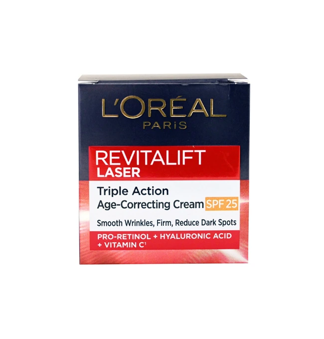 Revitalift Laser Triple Action Anti-Ageing Day Cream, now with a NEW formula, smoothes wrinkles, firms and brightens the look of skin. Formulated with 3 top derm actives, Pro-Retinol, Hyaluronic Acid and Vitamin C*, this formula targets signs of ageing and renews skins appearance—Pro-Retinol helps to smooth wrinkles and renew skin texture, Hyaluronic Acid intensely hydrate and re plump the skin, and Vitamin C* helps to boost skin radiance and visibly correct skin tone unevenness. Validated by dermatologists and effective on all skin types.